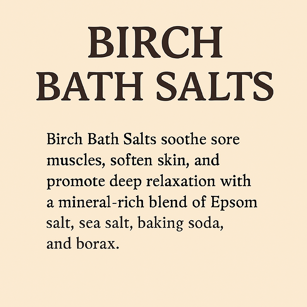 This bath salt blend offers you a great welcome home feeling when you sink deeply into a nice warm bath filled with the minty aroma of birch bath salts after a long demanding day at work or a fun day shopping.